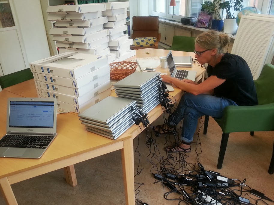Så tillslut, efter några dagars försening, kom våra nya datorer! Tjugofem stycken sprillans nya Chromebooks.